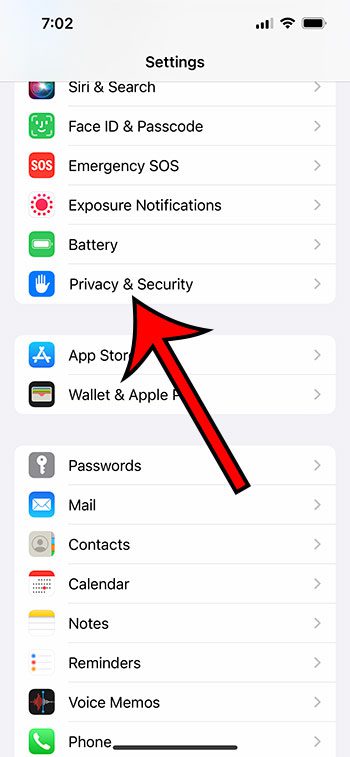 步骤 2:向下滚动并选择隐私与安全菜单中的选项。