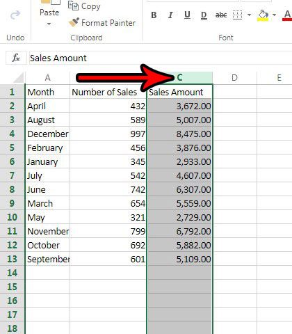 步骤 3:单击电子表格顶部的列标题以选择整个列。如果需要,您还可以选择多列。您可以按住控制键单击其他列时按键盘上的 键。这会将这些列添加到选择中,并且当您在下一步中隐藏这些列时,这些列也会被包含在内。