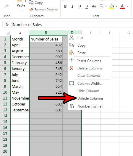 如果要取消隐藏某列,请选择隐藏列周围的两列,然后选择取消隐藏列选项。