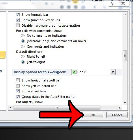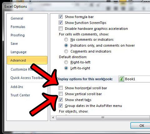 第 5 步:向下滚动到显示此工作簿的选项部分,然后取消选中左侧的框显示水平滚动条和显示垂直滚动条隐藏每个相应的滚动条。如果两个复选框均未选中(如下图所示),则工作簿中不会显示两个滚动条。