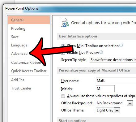 第四步:点击先进的在左侧的列中幻灯片选项窗户。