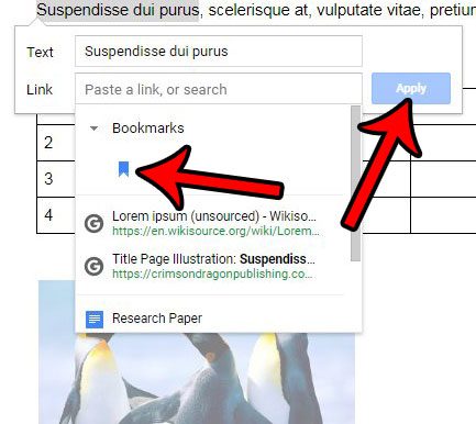 第 3 步:选择书签下拉链接,然后单击您创建的书签。然后您可以单击申请按钮来创建链接。