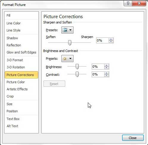 这个动作开启了新的设置图片格式窗口左侧包含许多不同的图像编辑菜单。