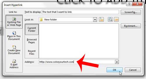 步骤 5:输入您要链接到的网站的地址地址窗口底部的字段,然后单击好的按钮。如果您不知道网站的地址,您可以随时在 Web 浏览器中打开该页面,然后将网页地址 (URL) 复制并粘贴到地址场代替。