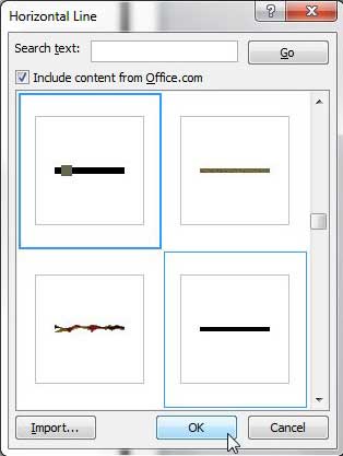 例如,如果您正在寻找精美的曲线线,您可以在此菜单上找到一条。单击该选项一次以将其突出显示为蓝色,然后单击好的按钮将该行插入到文档中。