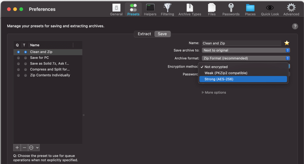 只需下载并安装该应用程序,然后打开BetterZip 偏好设置。在节省 选项卡,您可以自定义不同级别加密的选项。