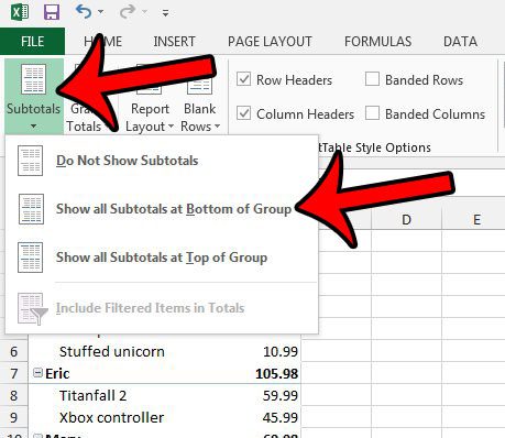通过单击设计窗口顶部的选项卡,单击小计按钮在布局功能区部分,然后单击在组底部显示所有小计选项。