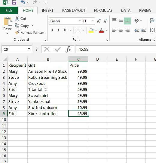 例如,如果您有一个亚马逊 Fire TV 棒(亚马逊链接)对于名为 Mary 的人,那么您可以在单元格 A2 中输入“Mary”,在单元格 B2 中输入“Amazon Fire TV Stick”,在单元格 C2 中输入“39.99”。