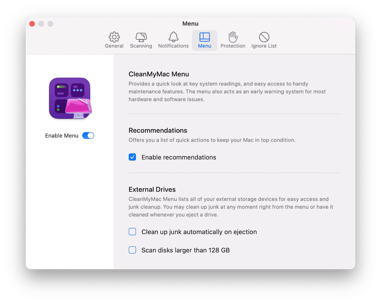 如果由于某种原因,您在菜单栏中看不到 iMac 图标,请打开 CleanMyMac 并转至“设置”>“菜单”以启用它。