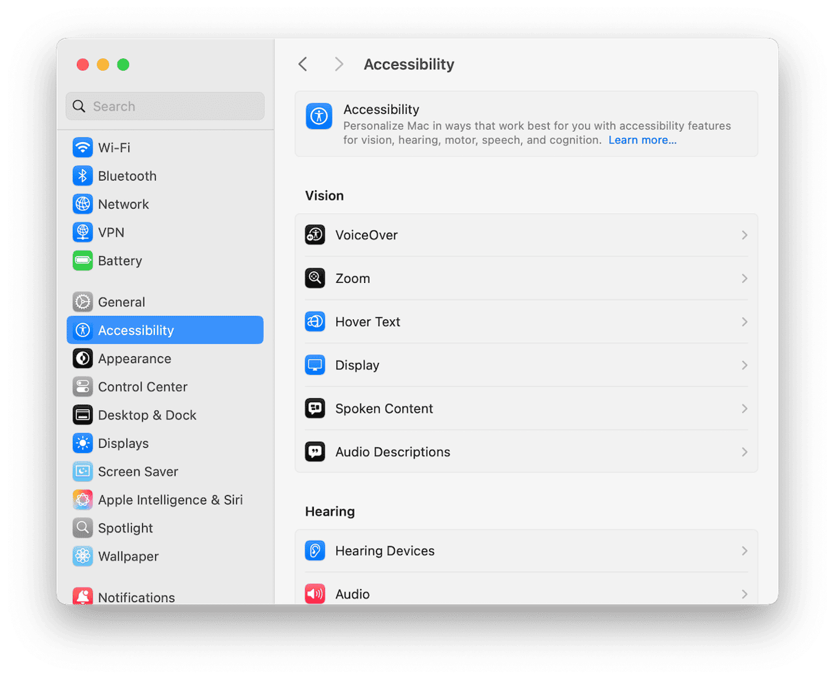 提示:您还可以使用系统设置顶部的搜索栏。键入 Zoom 或 VoiceOver 会将您直接跳转到相关面板。节省时间。