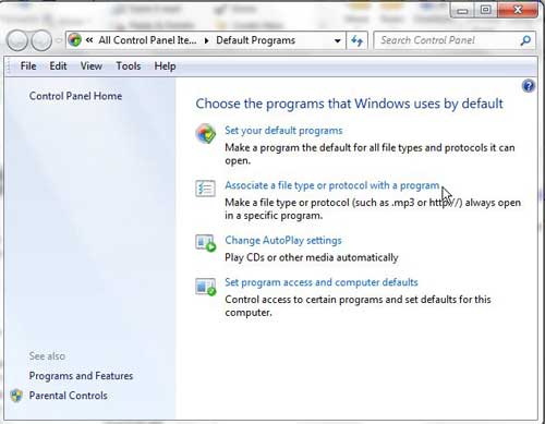 单击蓝色将文件类型或协议与程序关联链接位于窗口中央。