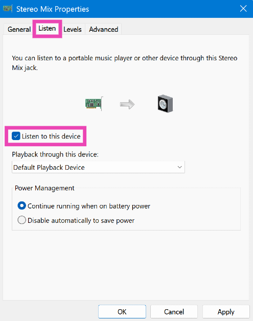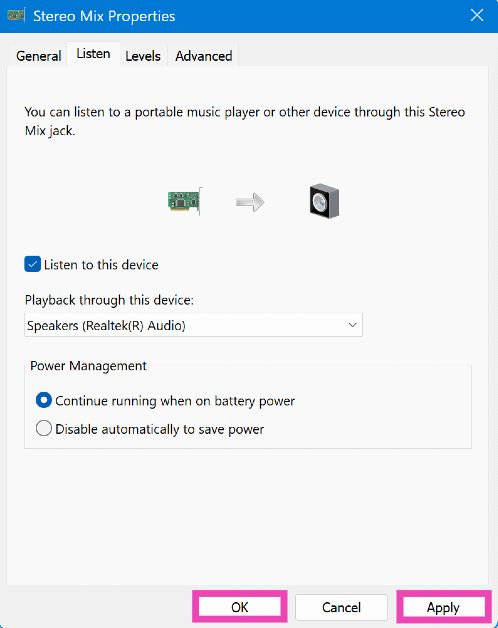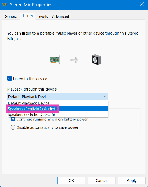 前往设置>系统>声音并选择主要音频设备。然后,前往更多声音设置>录音,右键单击“立体声混音”并启用它。再次右键单击“立体声混音”并将其设置为默认设备。现在,双击“立体声混音”并转到“聆听”选项卡。选择“收听此设备”,点击下拉菜单,然后选择您的辅助扬声器。点击应用并确定。