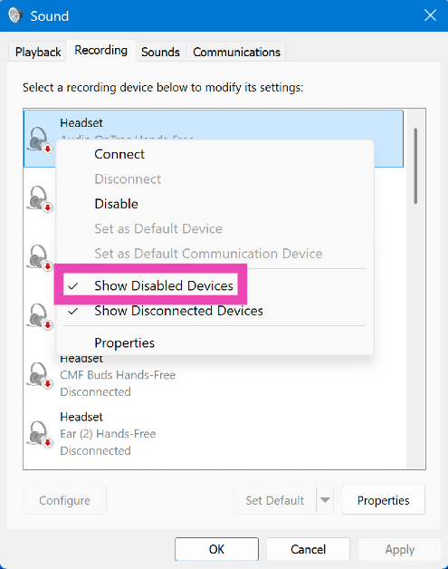 第5步:切换到记录选项卡。右键单击任何设备并确保“显示禁用的设备' 被选中。