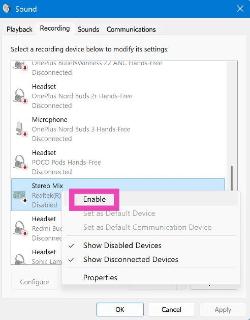 第6步:向下滚动并右键单击立体声混音。选择使能够。
