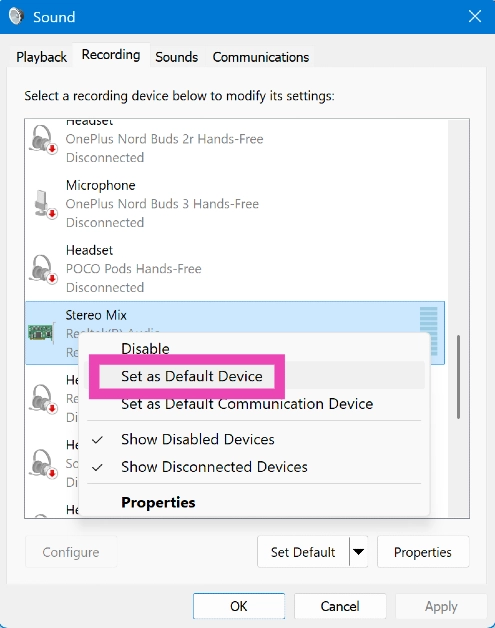 第7步:再次右键单击“立体声混音”并选择设置为默认设备。