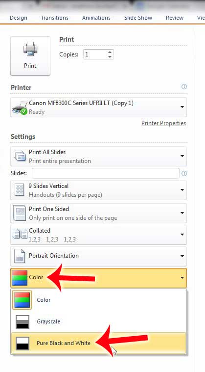 请注意,当您在 Powerpoint 2010 中打开新演示文稿时,此设置不会保留。您需要为想要以黑白打印的任何其他 Powerpoint 幻灯片进行此选择。