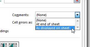 第七步:点击右侧的下拉菜单评论,然后单击如表中所示选项将其打印在实际电子表格上的相应位置,或选择在表的末尾选项将它们打印在打印电子表格末尾的单独页面上。