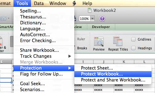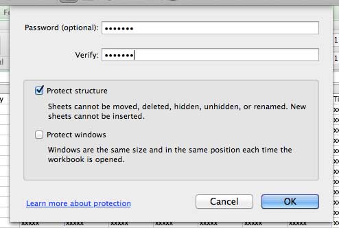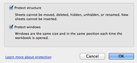 这保护Excel 2011 中的功能实际上允许您指定是保护当前活动工作表的某些元素还是保护整个工作簿的结构。