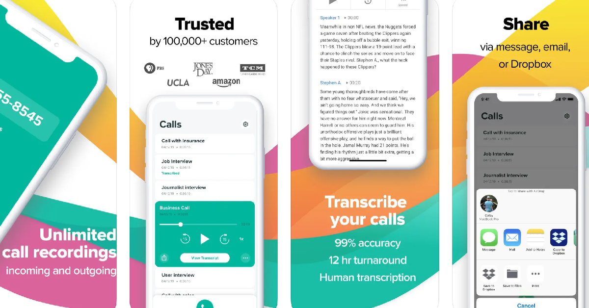 Rev Call Recorder还为您的呼叫记录提供人体抄录。由于转录是由人类而不是AI完成的,因此几乎没有错误的余地。这不是免费功能,用户每分钟的音频收取充电。使用此应用程序的唯一缺点是,一旦您点击记录按钮,它就会播放录制公告。如果您想要一种更加不起眼的录制呼叫方法,请查看下一个方法。