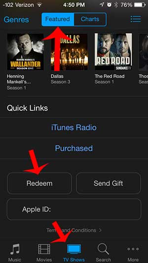 第 2 步:滚动到“音乐”、“电影”或“电视节目”选项卡上“精选”部分的底部,然后点击赎回按钮。