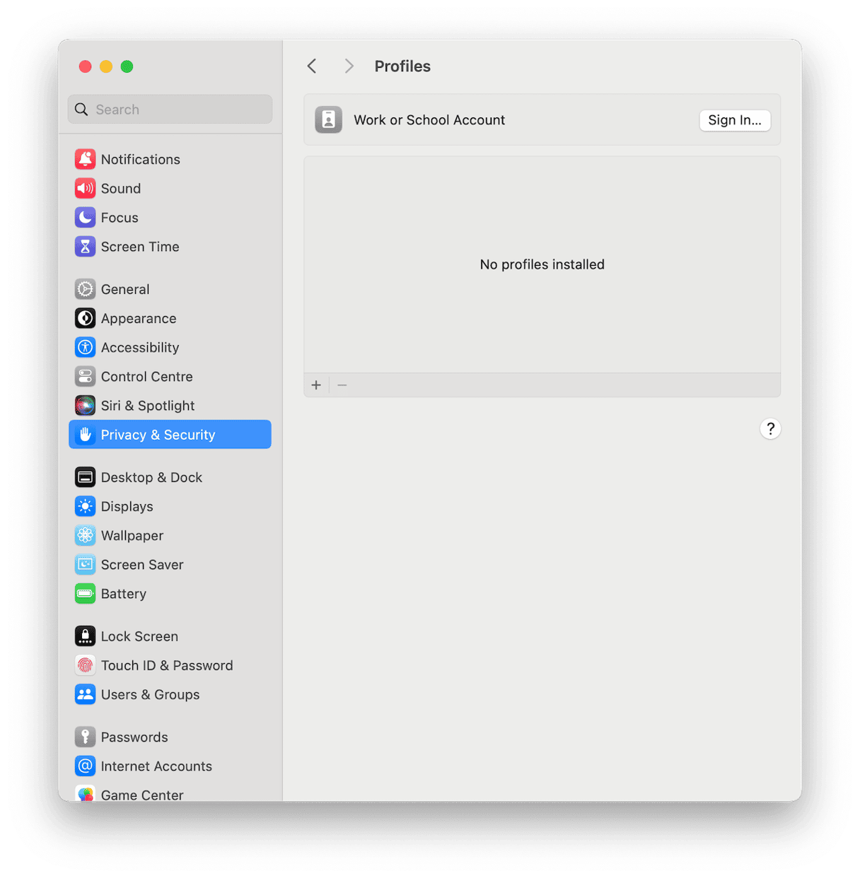 - 打开系统设置并转到隐私和安全 > 配置文件。