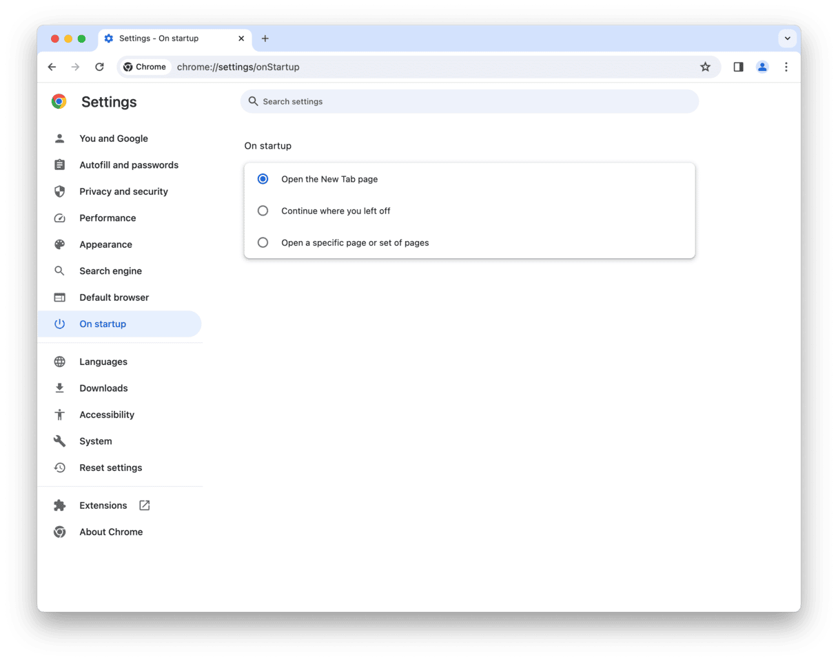- 选择您想要的起始页选项。如果要指定主页的 URL,请选择打开特定页面或一组页面并输入 URL。