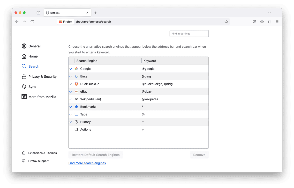 - 在侧边栏中选择“搜索引擎”,然后从菜单中选择您想要的默认搜索引擎。