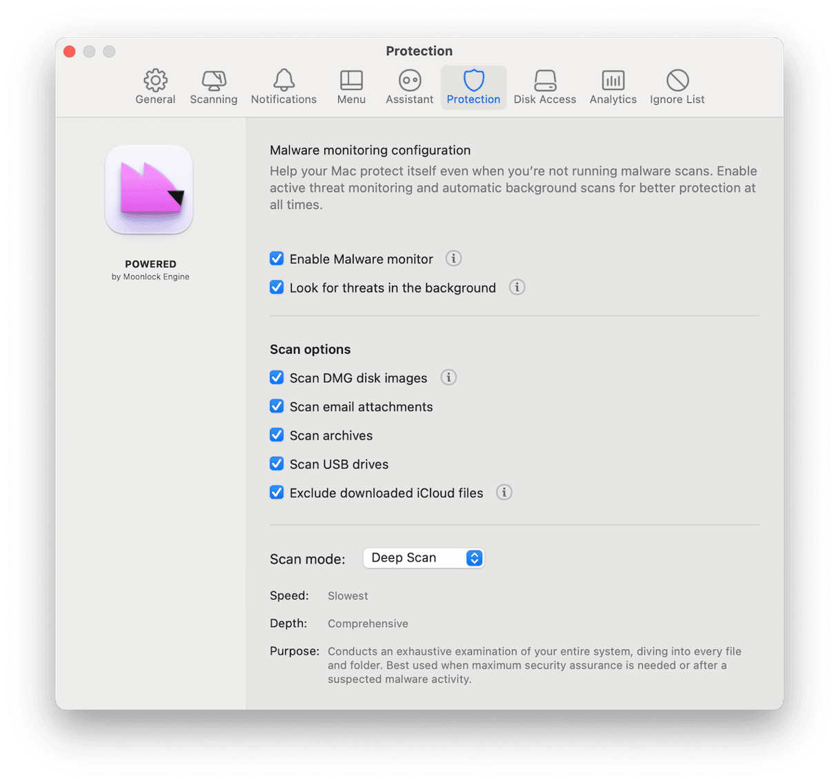 您可以选择扫描速度和深度的平衡。例如,如果您刚刚花时间重新配置 Web 浏览器,因为它们被 chillsearch.xyz 感染,您可能需要运行深度扫描以确保获得所有内容。在其他情况下,当您时间紧迫且没有理由怀疑 Mac 上存在恶意软件时,您可能需要选择更快的扫描。
