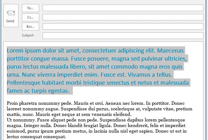 步骤 2:使用鼠标突出显示电子邮件正文中您要清除格式的文本。如果您想选择邮件的整个正文,请单击电子邮件正文中的某处,然后按Ctrl + A在你的键盘上。