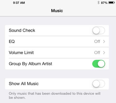 更新到 iOS 7 后,iPad 2 上的音乐默认设置将显示您的所有歌曲。