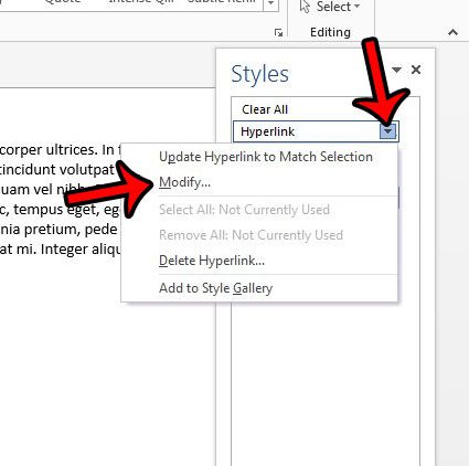 以下步骤将调整文档的样式,以便从所有超链接中删除下划线。超链接将保持当前的颜色。如果您不希望人们能够单击文档中的链接,您可以完全删除超链接。