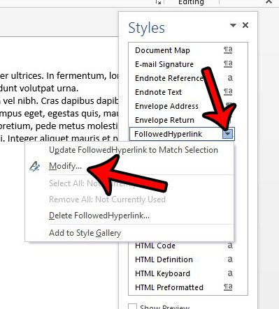 如果您已经单击了文档中的超链接,Microsoft Word 处理它们的方式会略有不同。这些称为“跟随的超链接”,如果您已经单击了文档中的某些链接,那么您可能会注意到,在完成上述步骤后,这些链接仍然带有下划线。
