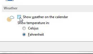 第6步:点击左侧的方框在日历上显示天气删除复选标记。