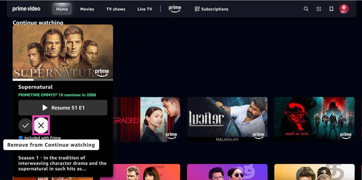 在 Prime Video 网站上,将光标移至“继续观看”部分中的标题,然后单击十字图标。在 Prime Video 应用程序上,长按“继续观看”部分中的标题,然后选择“隐藏此视频”。