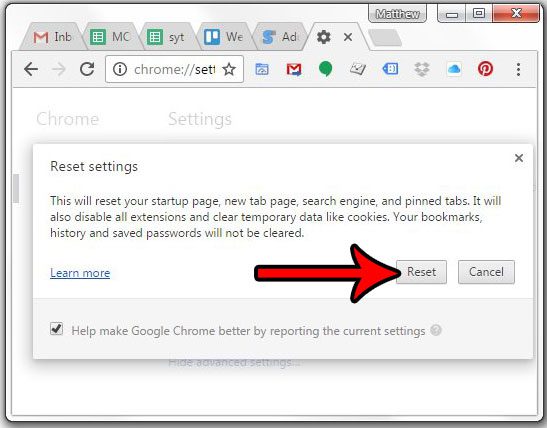 我们的指南在下面继续提供有关如何将 Chrome 重置为默认设置的其他信息,包括这些步骤的图片。