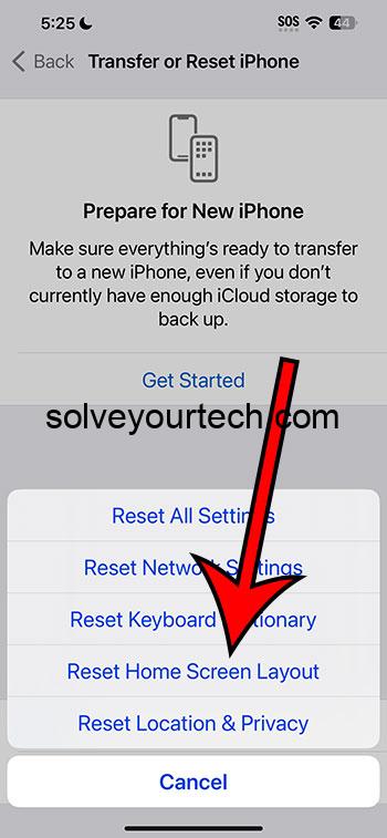 步骤 4:选择“重置”,然后选择“重置主屏幕布局”