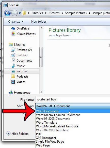 请注意,此方法仅适用于文件扩展名为 .docx 的 Word 文件。扩展名为 .doc 的文件不支持旋转文本框。如果您没有看到我们下面引用的绿色句柄,那么您的文件很可能是以 .doc 文件格式保存的。您可以通过单击来修复此问题文件->另存为-> 单击旁边的下拉菜单另存为类型,然后选择列表顶部的 Word 文档选项。