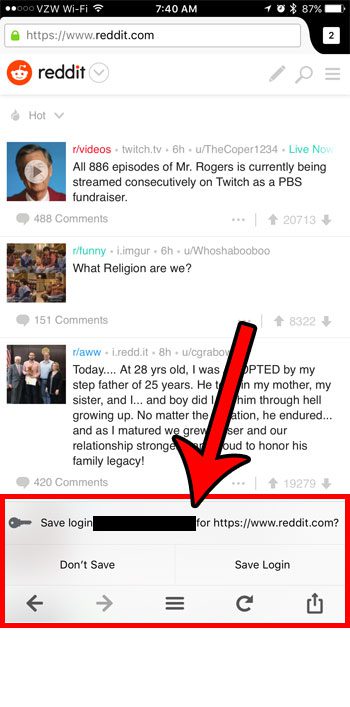 然后,当您输入网站的用户名和密码并登录时,您将在屏幕底部看到一个灰色条,询问您是否要保存登录信息。该屏幕的示例如下图所示。