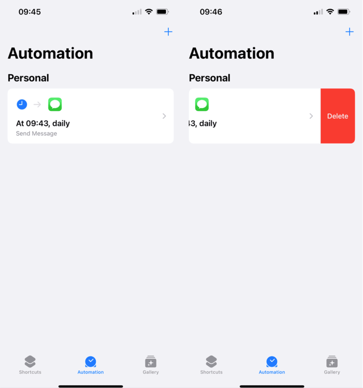 - 向下滚动到您预定的短信,向左滑动,然后点击删除。您的短信快捷方式将从自动化中删除。