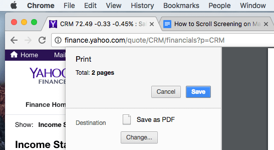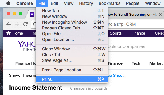 假设您想从雅虎财经中提取一份损益表。首先,在网络浏览器上打开页面。这里,我以我的 Mac 上使用 Chrome 为例。