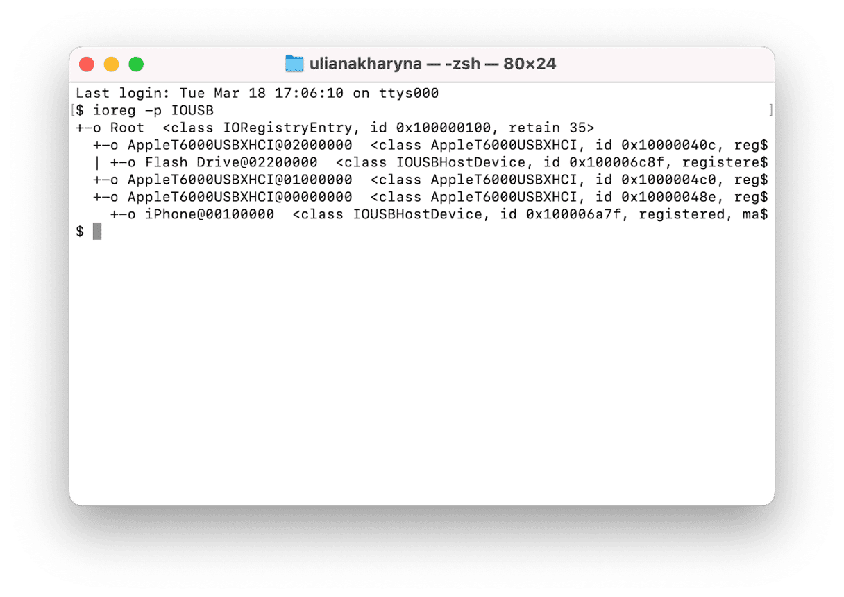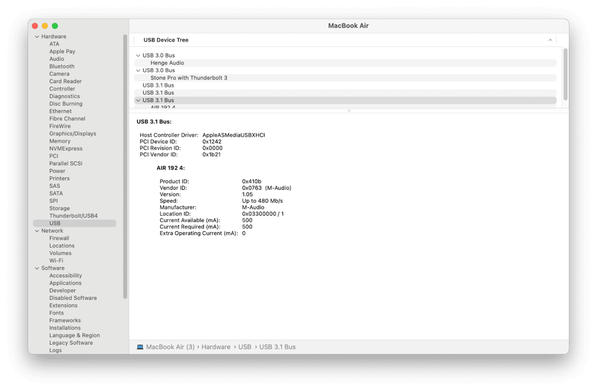 - 在打开的窗口中,在侧边栏中选择USB - 在主窗口的顶部,您将看到列出的USB总线,Mac上的每个USB端口一个。选择其中一辆USB总线,您应该看到所有设备在下面连接。如果设备不存在,请尝试另一辆USB总线。