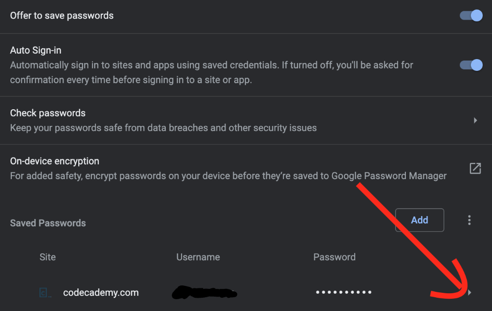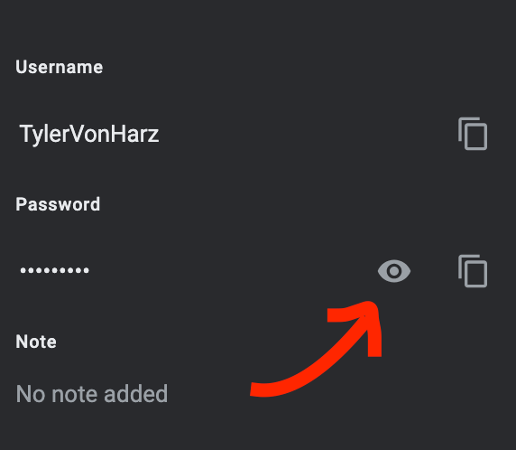 您会注意到密码仍然是隐藏的,而用户名是可见的。如果您想查看特定密码,则需要直接单击其右侧的小箭头。
