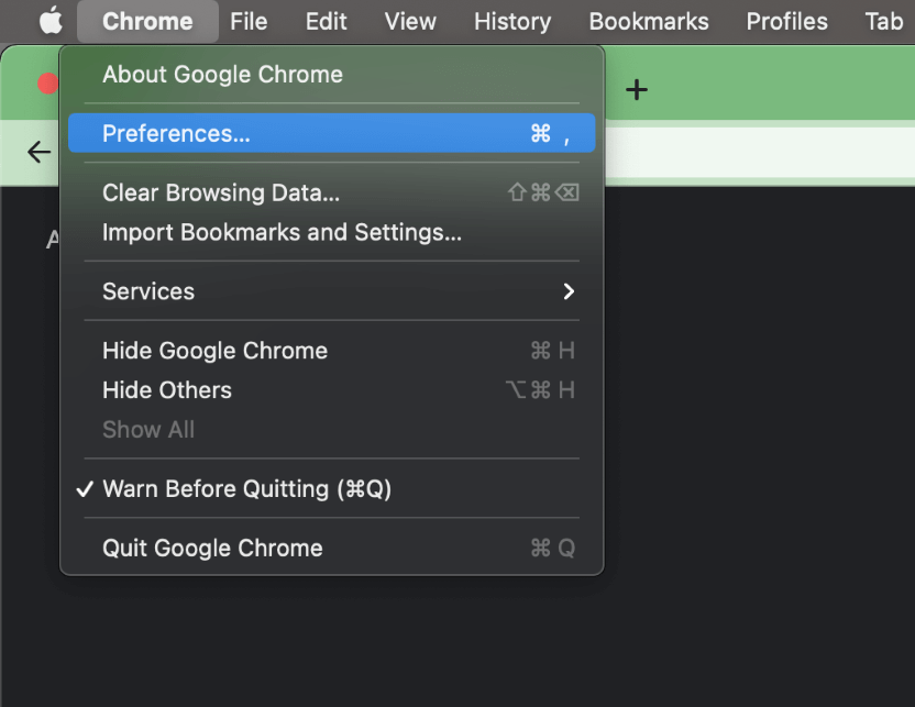 步骤2:打开 Chrome 后,单击铬合金在屏幕顶部,然后选择偏好设置从下拉菜单中。