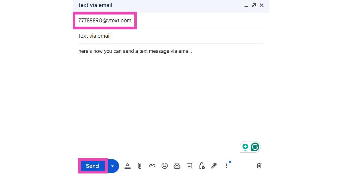 步骤2:在收件人地址字段中,输入收件人的地址电话号码其次是其服务提供商的 SMS 网关。例如,Verizon 的 SMS 网关是vtext.com。对于 AT&T,网关是txt.att.net。如果收件人号码是“7778889990”,请输入7778889990@vtext。com 在收件人地址字段中。