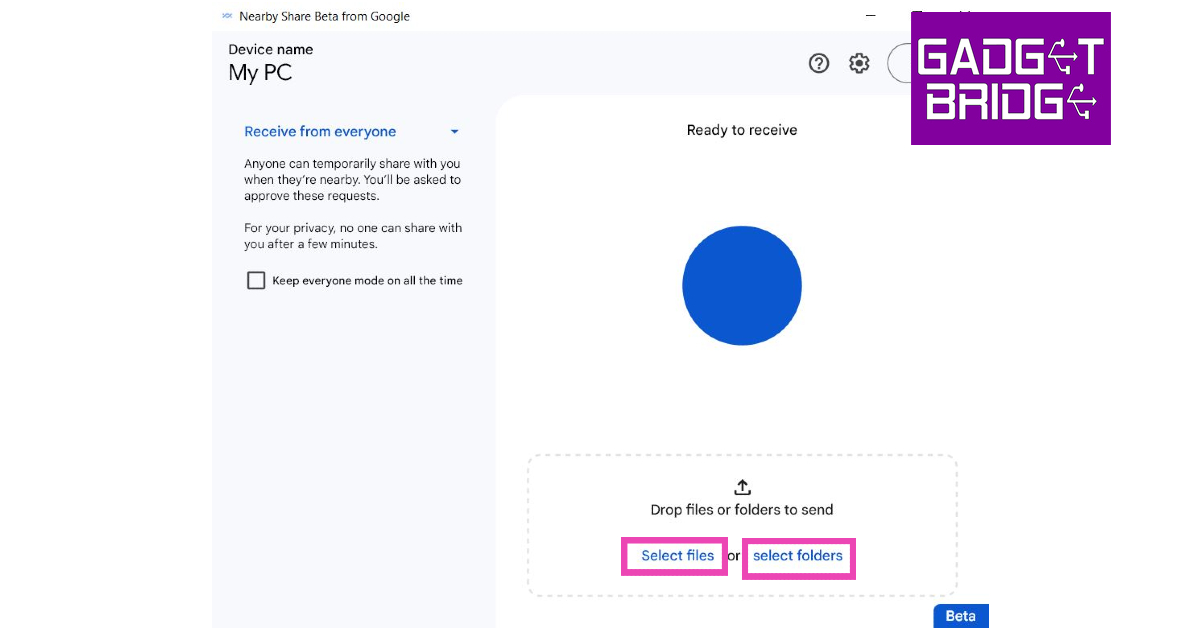 您可以通过这种方式在 PC 和 Android 智能手机之间无线发送和接收文件。截至目前,您只能在 PC 上使用“附近共享”的 Beta 版本。这意味着您在使用它时可能会遇到一些错误和故障。这些问题将在应用程序的完整版本中得到解决。测试版应用程序的可用性取决于您所在的位置。查看安卓官方网站了解更多。