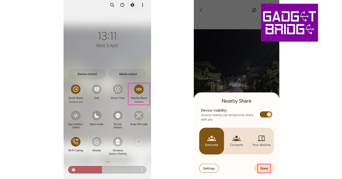 第4步:确保您的 Android 智能手机上启用了附近共享。您可以通过从“快速设置”面板中选择“附近共享”来执行此操作。打开设备的可见性并确保每个人都可以看到它。
