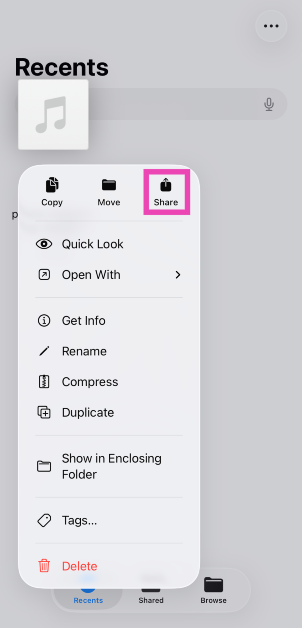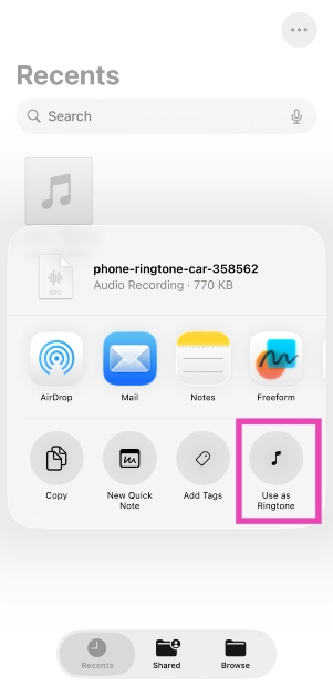 启动“文件”应用程序,转到音频文件,长按该文件,点击“共享”,然后选择“用作铃声”。此方法需要将您的 iPhone 更新至 iOS 26。