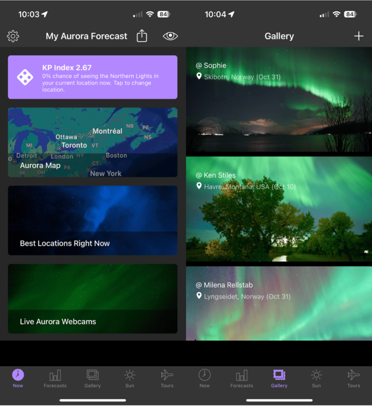 - 使用类似的应用程序极光预报帮助您找到观看北极光的最佳日期、时间和地点。
