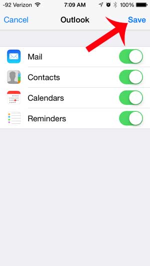 步骤 6:从 Hotmail 帐户中选择要与 iPhone 同步的信息,然后触摸节省按钮位于屏幕右上角。