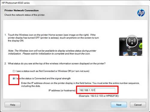 第 12 步:选择我看到状态已连接以及信号强度选项,将上一步中的 IP 地址输入到IP地址字段,然后点击下一个按钮。如果您在上一步中错过了 IP 地址,您始终可以通过点击打印机触摸屏上的无线图标来找到它,就像您在步骤7。